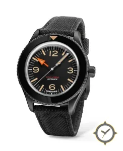 Eine Taucheruhr-Uhr mit einem 33.5mm Gehäuse im Vintage-Stil gefertigt aus Edelstahl mit einem Zifferblatt in schwarz und einer besonderen "matte"-Oberfläche.
