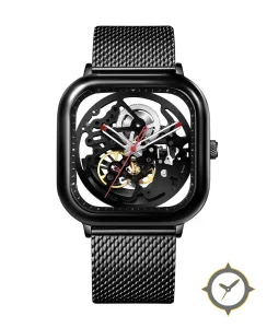 Eine Skelett-Uhr gefertigt aus Edelstahl mit einem Zifferblatt in schwarz und einer besonderen "skeleton/open-work"-Oberfläche.
