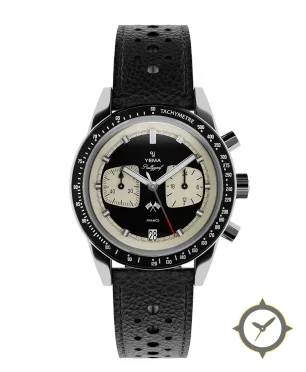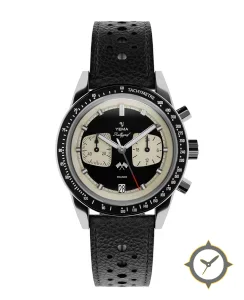 Eine Reverse Panda-Uhr mit einem 35.5mm Gehäuse im Vintage-Stil gefertigt aus Edelstahl mit einem Zifferblatt in schwarz und einer besonderen "lacquer"-Oberfläche.
