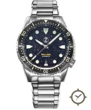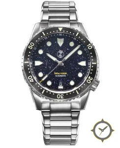 Eine Taucheruhr-Uhr mit einem vielseitigen 41mm Gehäuse, das an fast jedes Handgelenk passt, gefertigt aus Edelstahl mit einem Zifferblatt in marineblau und einer besonderen "sparkling/aventurine (starfield)"-Oberfläche.