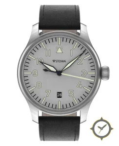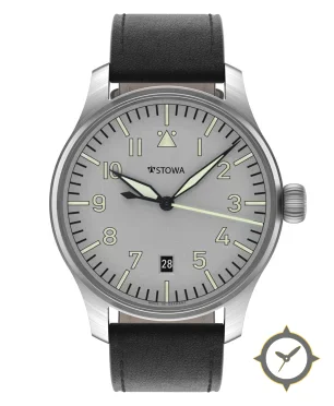 Eine Pilot-Uhr mit einem vielseitigen 40mm Gehäuse, das an fast jedes Handgelenk passt, gefertigt aus Edelstahl mit einem Zifferblatt in grau und einer besonderen "matte-grain"-Oberfläche.