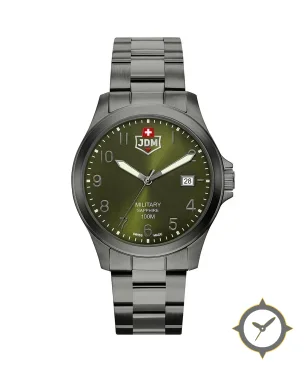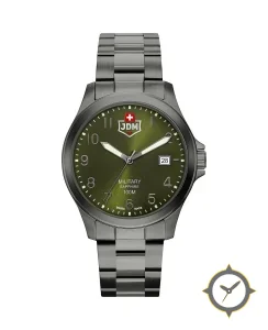 Eine Militär-Uhr mit einem vielseitigen 40.5mm Gehäuse, das an fast jedes Handgelenk passt, gefertigt aus Edelstahl mit einem Zifferblatt in grün und einer besonderen "sunburst"-Oberfläche.