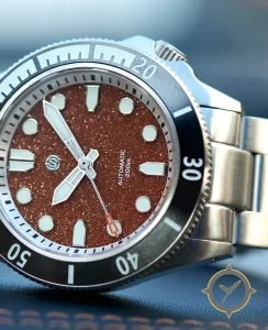 Eine Taucheruhr-Uhr mit einem markanten 43mm Auftritt am Handgelenk, gefertigt aus Edelstahl mit einem Zifferblatt in braun und einer besonderen "sparkling/grainy glitter finish"-Oberfläche.