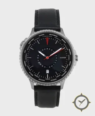 Eine Weltzeituhr-Uhr mit einem vielseitigen 41mm Gehäuse, das an fast jedes Handgelenk passt, gefertigt aus Edelstahl mit einem Zifferblatt in schwarz und einer besonderen "matte"-Oberfläche, ideal für Weltenbummler dank der Weltzeit-Funktion.