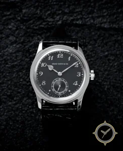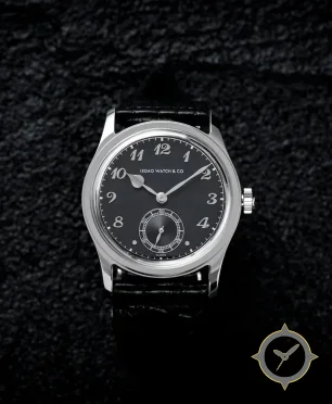Eine Dress-Uhr mit einem 29.5mm Gehäuse im Vintage-Stil gefertigt aus Edelstahl mit einem Zifferblatt in schwarz und einer besonderen "matte"-Oberfläche.