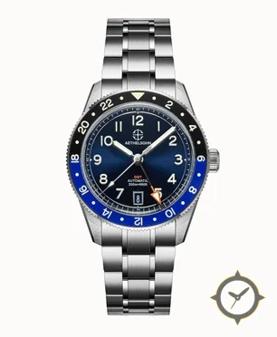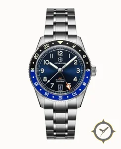 Eine GMT-Uhr mit einem markanten 43mm Auftritt am Handgelenk, gefertigt aus Edelstahl mit einem Zifferblatt in blau und einer besonderen "sunburst"-Oberfläche und einer echten GMT-Funktion, mit der du eine zweite Zeitzone verfolgen kannst.