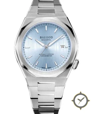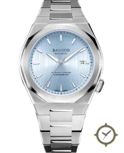 Eine Luxus-Uhr mit einem 35mm Gehäuse im Vintage-Stil gefertigt aus Edelstahl mit einem Zifferblatt in blau und einer besonderen "vertical guilloché / ribbed texture"-Oberfläche.