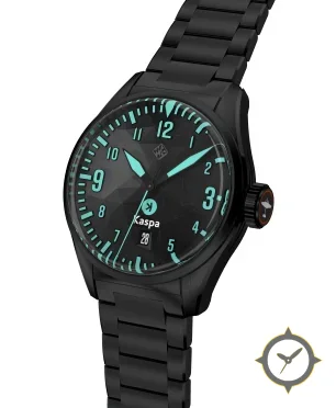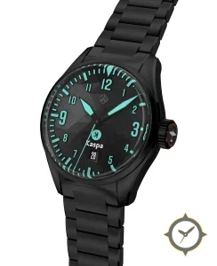 Eine Pilot-Uhr mit einem 37.5mm Gehäuse im Vintage-Stil gefertigt aus Beschichtung mit einem Zifferblatt in schwarz und einer besonderen "faceted"-Oberfläche.