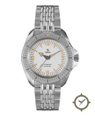 Eine Taucheruhr-Uhr mit einem 33mm Gehäuse im Vintage-Stil gefertigt aus Edelstahl mit einem Zifferblatt in weiß und einer besonderen "matte"-Oberfläche.