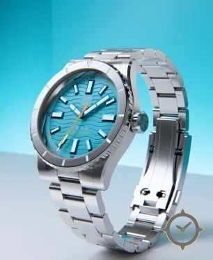 Eine Taucheruhr-Uhr mit einem vielseitigen 40.5mm Gehäuse, das an fast jedes Handgelenk passt, gefertigt aus Edelstahl mit einem Zifferblatt in türkis und einer besonderen "embossed wave texture"-Oberfläche.