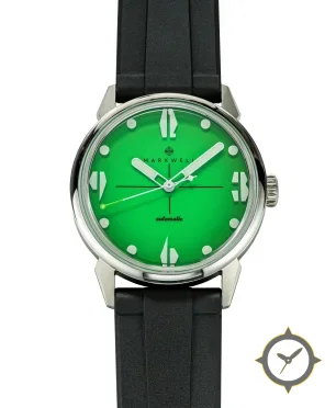 Eine Sport-Uhr mit einem 32mm Gehäuse im Vintage-Stil gefertigt aus Edelstahl mit einem Zifferblatt in grün und einer besonderen "gradient/fumé with vignette"-Oberfläche.