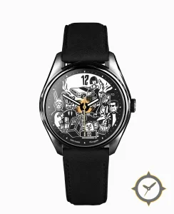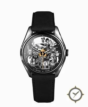 Eine Dress-Uhr mit einem markanten 44.5mm Auftritt am Handgelenk, gefertigt aus Edelstahl mit einem Zifferblatt in schwarz und einer besonderen "printed illustration"-Oberfläche.