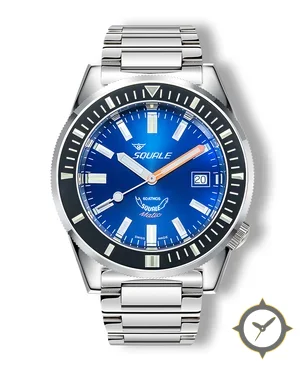 Eine Taucheruhr-Uhr mit einem markanten 43mm Auftritt am Handgelenk, gefertigt aus Edelstahl mit einem Zifferblatt in blau und einer besonderen "sunburst/gradient"-Oberfläche.