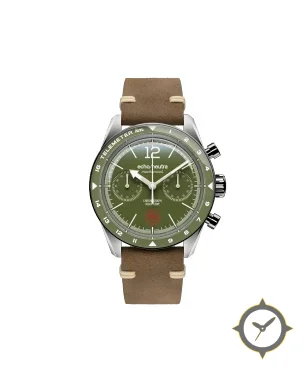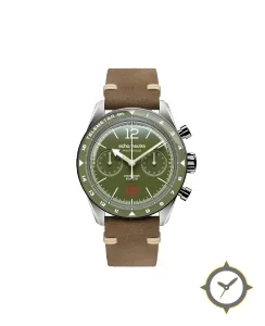 Eine Chronograph-Uhr mit einem markanten 42.5mm Auftritt am Handgelenk, gefertigt aus Edelstahl mit einem Zifferblatt in grün und einer besonderen "matte lacquer"-Oberfläche.