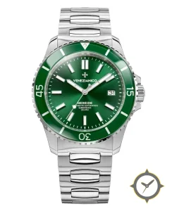 Eine Taucheruhr-Uhr mit einem markanten 46.5mm Auftritt am Handgelenk, gefertigt aus Edelstahl mit einem Zifferblatt in grün und einer besonderen "sunburst"-Oberfläche.