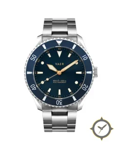 Eine Taucheruhr-Uhr mit einem 31.5mm Gehäuse im Vintage-Stil gefertigt aus Edelstahl mit einem Zifferblatt in blau und einer besonderen "sunburst"-Oberfläche.