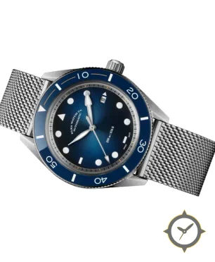 Eine Taucheruhr-Uhr mit einem 36.5mm Gehäuse im Vintage-Stil gefertigt aus Edelstahl mit einem Zifferblatt in blau und einer besonderen "sunburst"-Oberfläche.