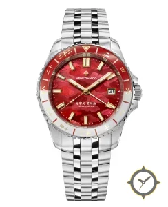 Eine GMT-Uhr mit einem markanten 46.5mm Auftritt am Handgelenk, gefertigt aus Edelstahl mit einem Zifferblatt in rot und einer besonderen "embossed cloud-pattern / textured lacquer"-Oberfläche und einer echten GMT-Funktion, mit der du eine zweite Zeitzone verfolgen kannst.