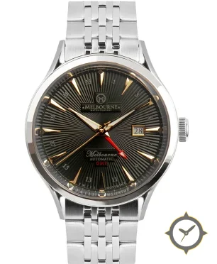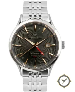 Eine GMT-Uhr mit einem vielseitigen 40mm Gehäuse, das an fast jedes Handgelenk passt, gefertigt aus Edelstahl mit einem Zifferblatt in grün und einer besonderen "sunburst guilloche (radiating lines)"-Oberfläche und einer echten GMT-Funktion, mit der du eine zweite Zeitzone verfolgen kannst.