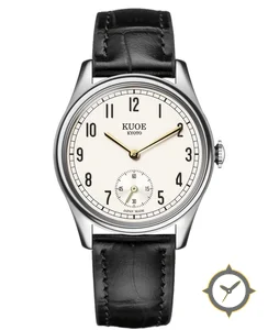 Eine Dress-Uhr mit einem vielseitigen 41mm Gehäuse, das an fast jedes Handgelenk passt, gefertigt aus Edelstahl mit einem Zifferblatt in weiß und einer besonderen "lacquer (smooth)"-Oberfläche.