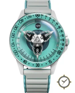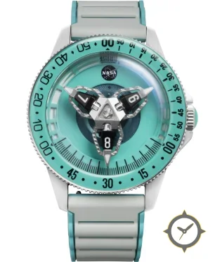 Eine Taucheruhr-Uhr mit einem markanten 49mm Auftritt am Handgelenk, gefertigt aus Edelstahl mit einem Zifferblatt in türkis und einer besonderen "matte"-Oberfläche.