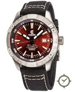 Eine Taucheruhr-Uhr mit einem markanten 41.5mm Auftritt am Handgelenk, gefertigt aus Edelstahl mit einem Zifferblatt in rot und einer besonderen "sunburst"-Oberfläche.