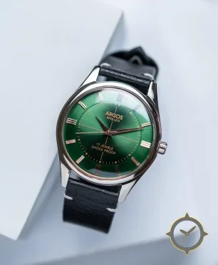 Eine Dress-Uhr mit einem markanten 44mm Auftritt am Handgelenk, gefertigt aus Edelstahl mit einem Zifferblatt in grün und einer besonderen "sunburst"-Oberfläche.