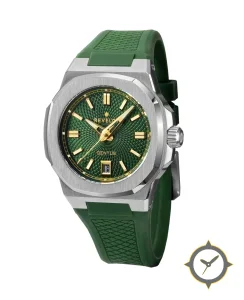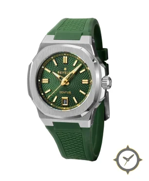 Eine Sport-Uhr mit einem markanten 45mm Auftritt am Handgelenk, gefertigt aus Edelstahl mit einem Zifferblatt in grün und einer besonderen "radial guilloché / waffle texture"-Oberfläche.