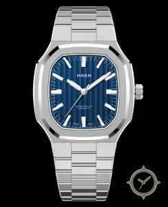 Eine Luxus-Uhr mit einem 35mm Gehäuse im Vintage-Stil gefertigt aus Edelstahl mit einem Zifferblatt in blau und einer besonderen "vertical striped / fluted (textured) finish"-Oberfläche.