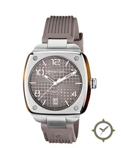 Eine Sport-Uhr mit einem 34mm Gehäuse im Vintage-Stil gefertigt aus Edelstahl mit einem Zifferblatt in braun und einer besonderen "clous de Paris / waffle grid"-Oberfläche.