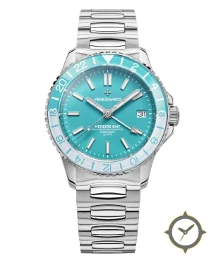 Eine GMT-Uhr mit einem 33mm Gehäuse im Vintage-Stil gefertigt aus Edelstahl mit einem Zifferblatt in türkis und einer besonderen "sunburst"-Oberfläche und einer echten GMT-Funktion, mit der du eine zweite Zeitzone verfolgen kannst.