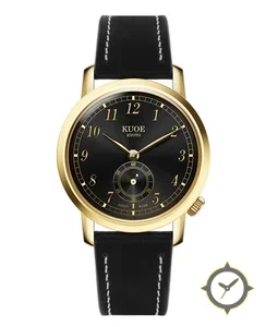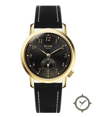 Eine Dress-Uhr mit einem 30mm Gehäuse im Vintage-Stil gefertigt aus Gold mit einem Zifferblatt in schwarz und einer besonderen "sunburst"-Oberfläche.