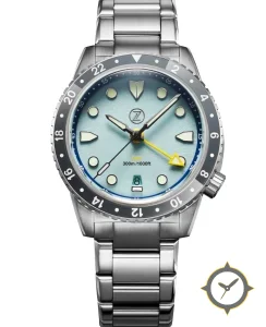 Eine GMT-Uhr mit einem 36mm Gehäuse im Vintage-Stil gefertigt aus Edelstahl mit einem Zifferblatt in türkis und einer besonderen "sunburst"-Oberfläche und einer echten GMT-Funktion, mit der du eine zweite Zeitzone verfolgen kannst.