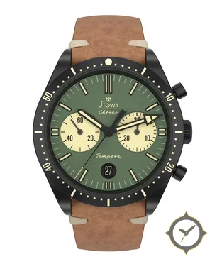 Eine Chronograph-Uhr mit einem markanten 41.5mm Auftritt am Handgelenk, gefertigt aus Edelstahl mit einem Zifferblatt in grün und einer besonderen "matte"-Oberfläche.