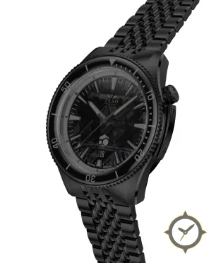 Eine Taucheruhr-Uhr mit einem markanten 48mm Auftritt am Handgelenk, gefertigt aus Edelstahl mit einem Zifferblatt in schwarz und einer besonderen "forged carbon / marbled texture"-Oberfläche.