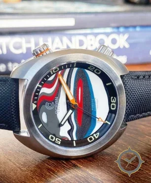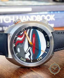 Eine Taucheruhr-Uhr mit einem vielseitigen 38.5mm Gehäuse, das an fast jedes Handgelenk passt, gefertigt aus Edelstahl mit einem Zifferblatt in weiß und einer besonderen "multicolored swirl / marbled pattern"-Oberfläche.