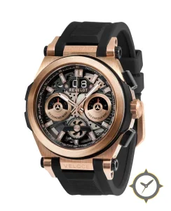 Eine Chronograph-Uhr mit einem markanten 46mm Auftritt am Handgelenk, gefertigt aus Gold mit einem Zifferblatt in schwarz und einer besonderen "skeleton/open-worked with metallic bridges"-Oberfläche.