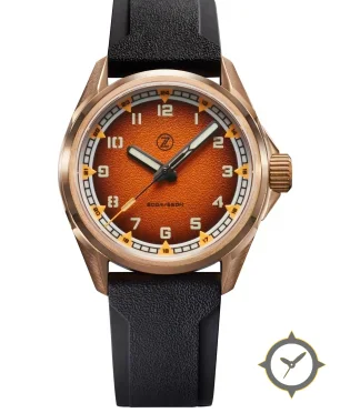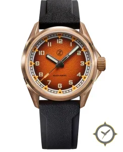 Eine Taucheruhr-Uhr mit einem markanten 45.5mm Auftritt am Handgelenk, gefertigt aus Bronze mit einem Zifferblatt in orange und einer besonderen "textured/grained with fumé gradient"-Oberfläche.