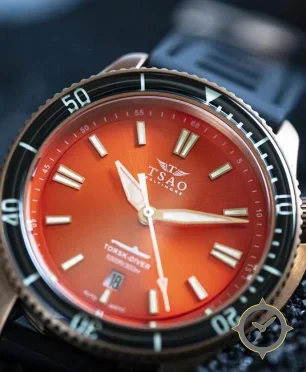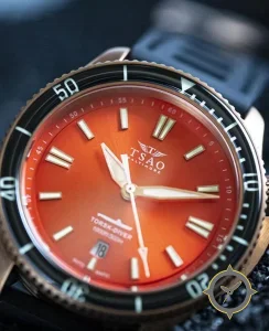 Eine Taucheruhr-Uhr mit einem markanten 44.5mm Auftritt am Handgelenk, gefertigt aus Bronze mit einem Zifferblatt in orange und einer besonderen "sunburst gradient"-Oberfläche.