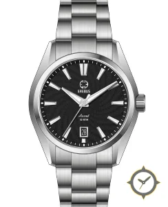 Eine Dress-Uhr mit einem vielseitigen 41mm Gehäuse, das an fast jedes Handgelenk passt, gefertigt aus Edelstahl mit einem Zifferblatt in schwarz und einer besonderen "radial guilloché / geometric texture"-Oberfläche.