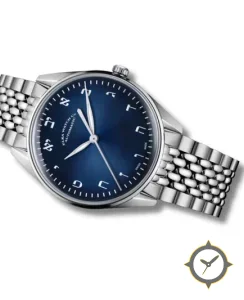 Eine Dress-Uhr mit einem 32.5mm Gehäuse im Vintage-Stil gefertigt aus Edelstahl mit einem Zifferblatt in blau und einer besonderen "sunburst radial (gradient)"-Oberfläche.