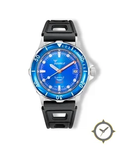 Eine Taucheruhr-Uhr mit einem 35.5mm Gehäuse im Vintage-Stil gefertigt aus Edelstahl mit einem Zifferblatt in blau und einer besonderen "sunburst"-Oberfläche.
