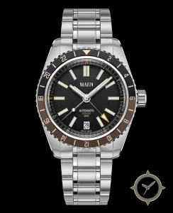 Eine GMT-Uhr mit einem markanten 41.5mm Auftritt am Handgelenk, gefertigt aus Edelstahl mit einem Zifferblatt in schwarz und einer besonderen "grained/texture (matte sandblast)"-Oberfläche und einer echten GMT-Funktion, mit der du eine zweite Zeitzone verfolgen kannst.