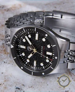 Eine Taucheruhr-Uhr mit einem 37mm Gehäuse im Vintage-Stil gefertigt aus Edelstahl mit einem Zifferblatt in schwarz und einer besonderen "speckled (starry)"-Oberfläche.