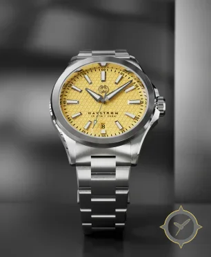 Eine Sport-Uhr mit einem markanten 44.5mm Auftritt am Handgelenk, gefertigt aus Edelstahl mit einem Zifferblatt in gelb und einer besonderen "textured geometric triangular pattern (triangular guilloché)"-Oberfläche.