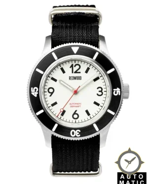 Eine Taucheruhr-Uhr mit einem markanten 47.5mm Auftritt am Handgelenk, gefertigt aus Edelstahl mit einem Zifferblatt in weiß und einer besonderen "matte"-Oberfläche.