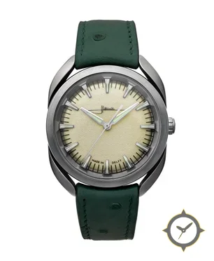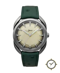 Eine Vintage-Uhr gefertigt aus Edelstahl mit einem Zifferblatt in weiß und einer besonderen "frosted / sandblasted (grained)"-Oberfläche.
