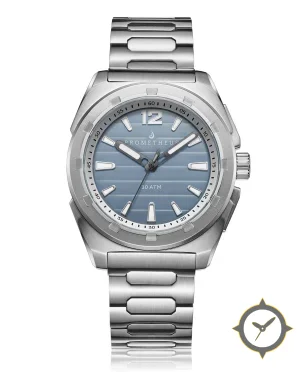 Eine Taucheruhr-Uhr mit einem 34.5mm Gehäuse im Vintage-Stil gefertigt aus Edelstahl mit einem Zifferblatt in blau und einer besonderen "matte"-Oberfläche.