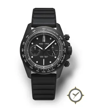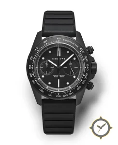 Eine Chronograph-Uhr mit einem 34mm Gehäuse im Vintage-Stil gefertigt aus Edelstahl mit einem Zifferblatt in schwarz und einer besonderen "matte"-Oberfläche.