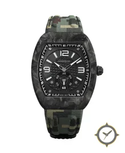 Eine Militär-Uhr gefertigt aus Carbon mit einem Zifferblatt in schwarz und einer besonderen "woven carbon fiber"-Oberfläche.